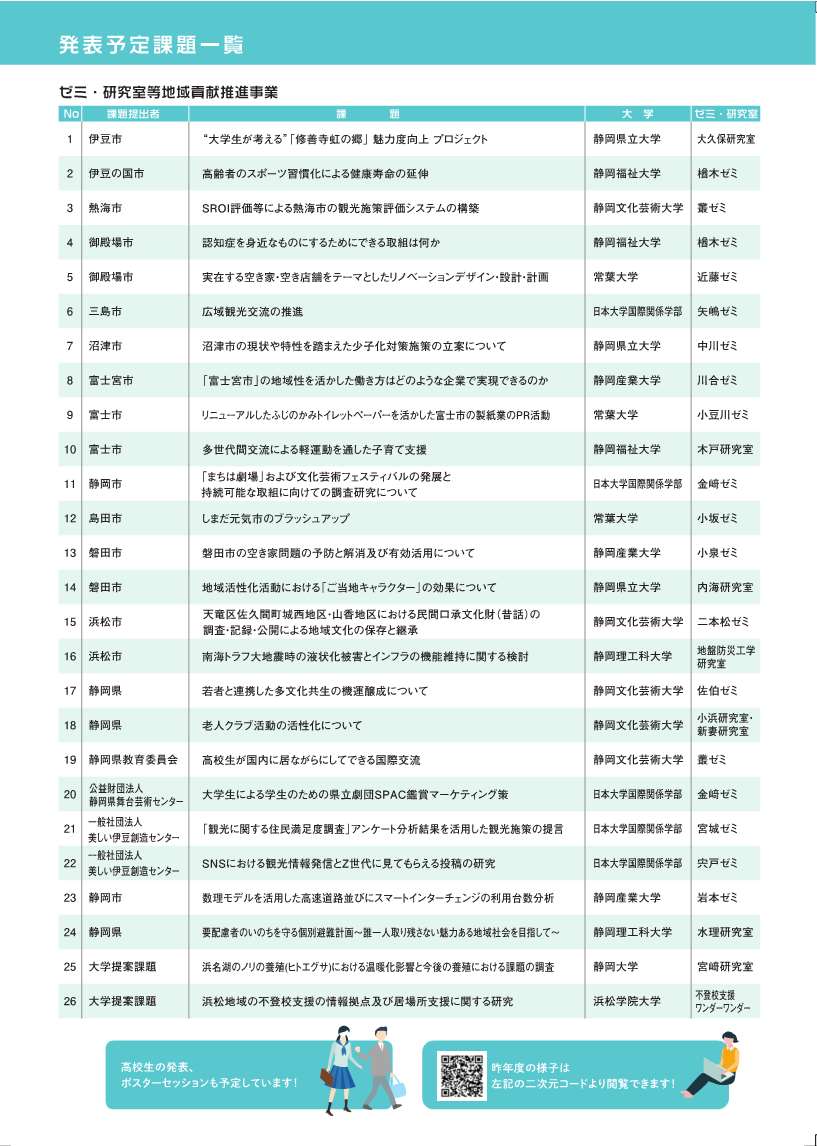 問い合わせ 公益社団法人ふじのくに地域・大学コンソーシアム 054-249-1818